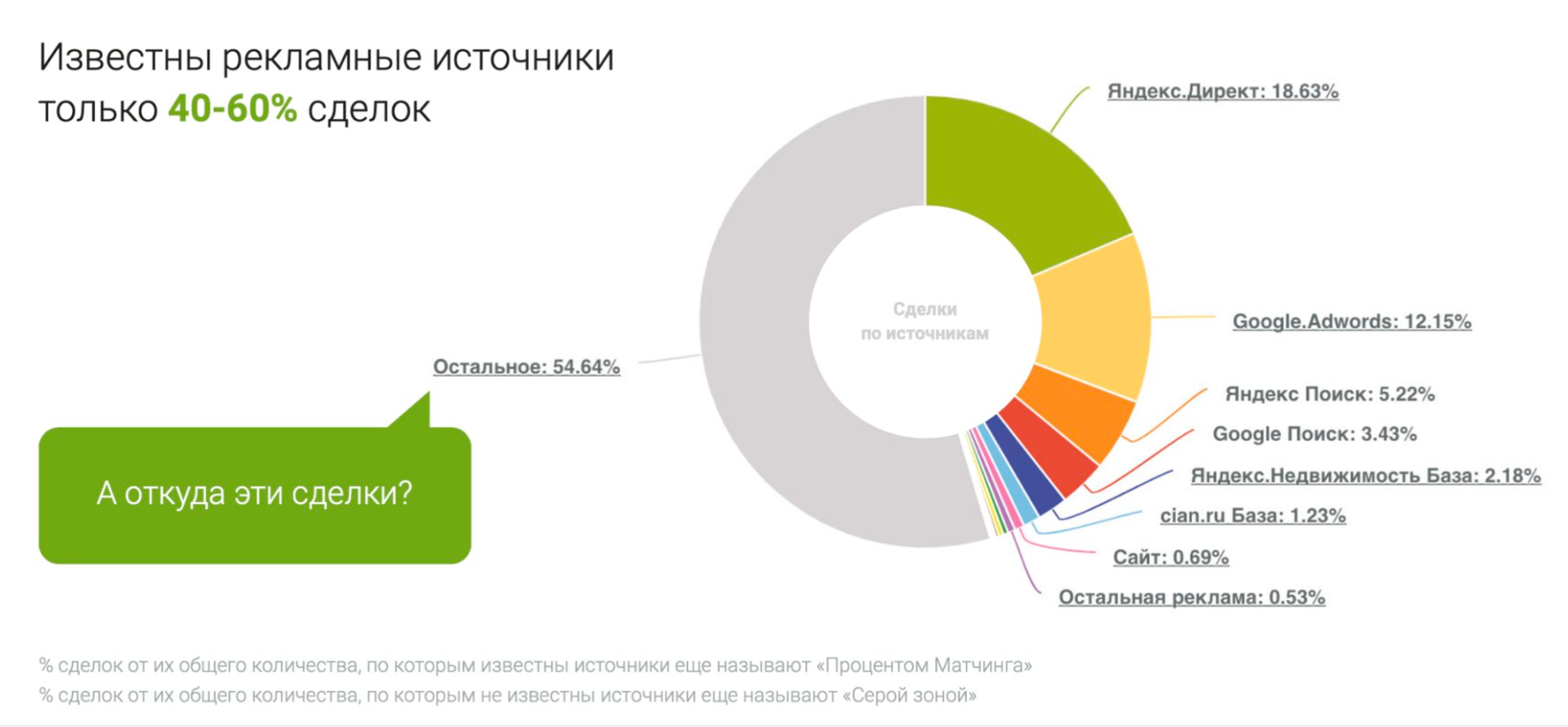 Как правило застройщики знают источники только у половины сделок. Это мешает правильно оценивать эффективность рекламных каналов, и, как следствие, правильно распределять рекламный бюджет. Перспективные каналы остаются в тени, а убыточные будут получать финансирование.