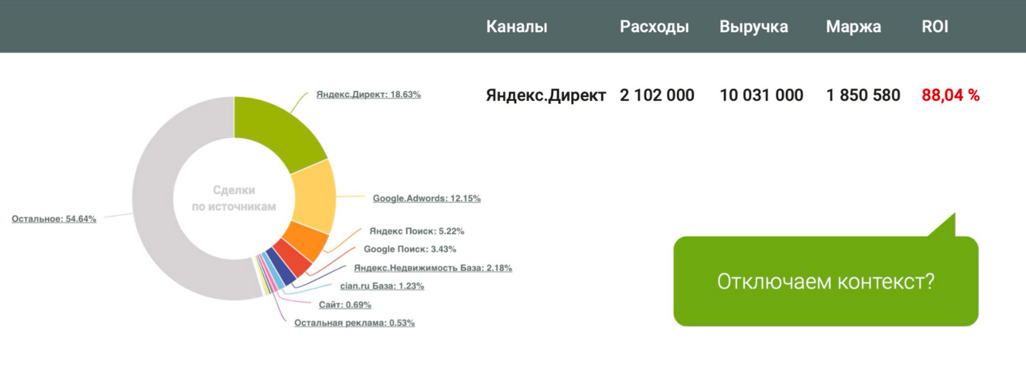 Из этого делаем вывод, о том, что контекстная реклама не окупается, а значит ее нужно отключать. Но опыт и интуиция подсказывают, что контекст должен работать и приводить сделки, а значит нужно разобраться.