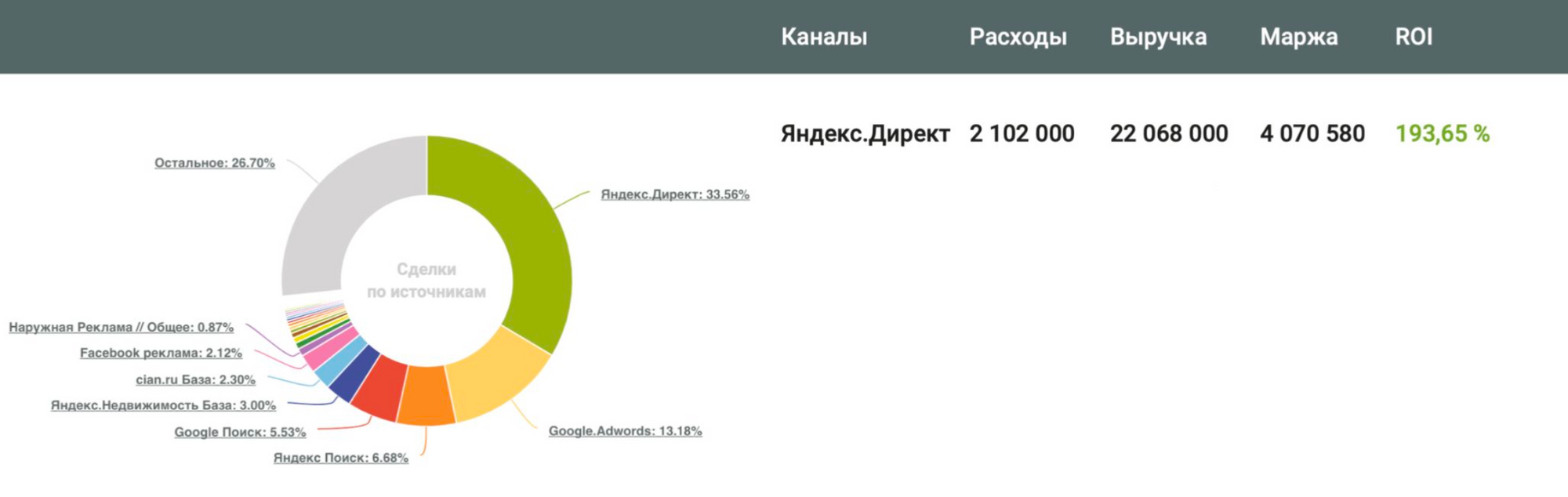 Как мы видим, доля Яндекс.Директа составляет 18%, а ROI – 88%.