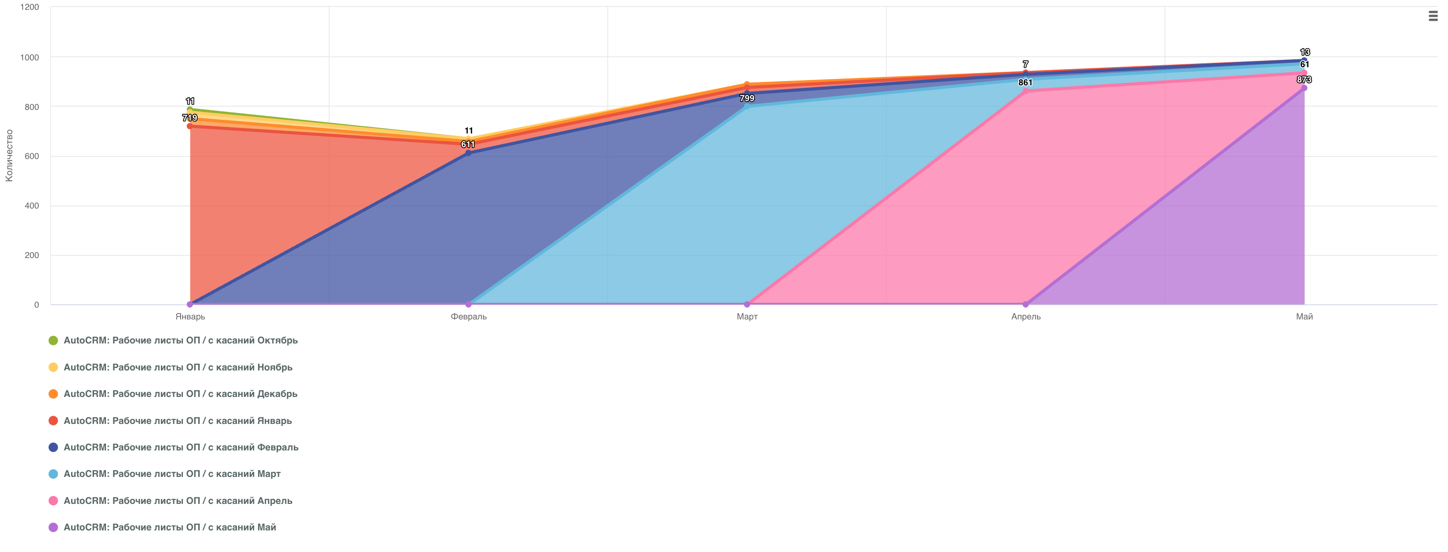 На графике видно, как половина касаний апреля привела сделки только в мае. Также можно заметить, что часть мартовских касаний превратились в сделки в апреле и в мае. И даже февральские касания в меньшей степени, но «докатились» до апреля и мая.