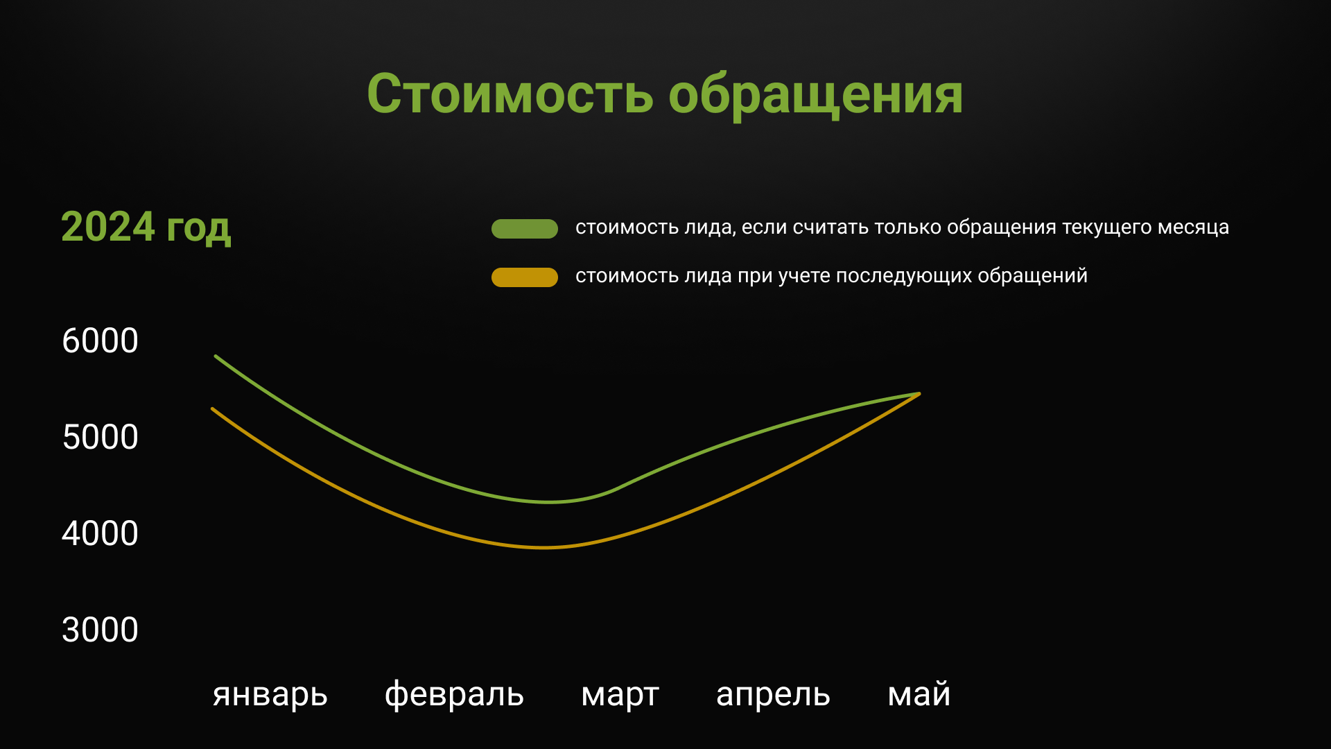 - Нижняя линия – стоимость лида с учетом того, что в рамках одного месяца пришли клиенты предыдущих месяцев. При таком подходе стоимость обращения становится ниже на 12%.