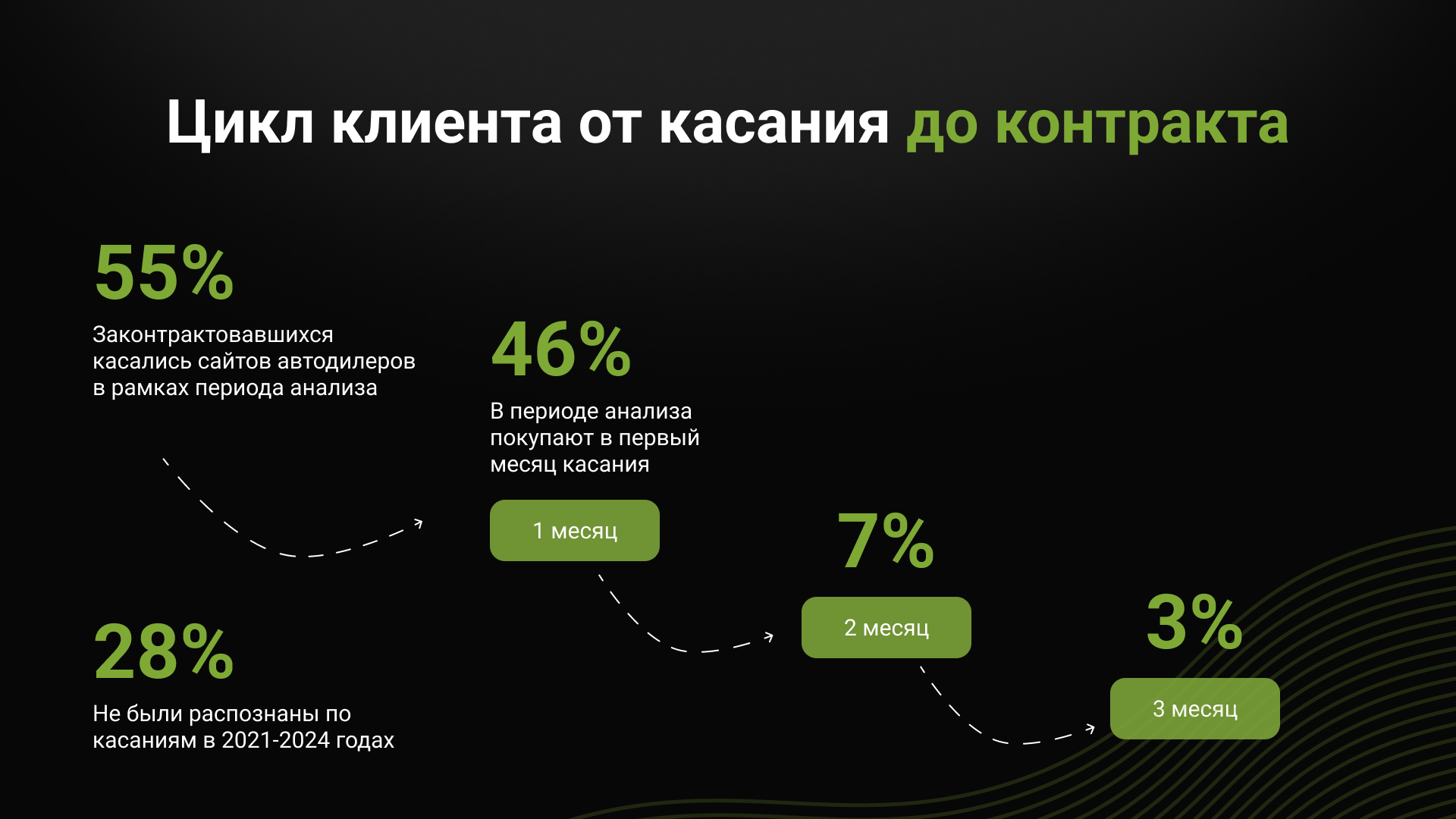 Наши коллеги из дилерского центра «Автопортрет» при помощи Smartis обнаружили, что от первого касания с рекламой до сделки может пройти несколько месяцев. А значит, результаты продвижения нужно смотреть спустя время, а при оценке рекламы нужно учитывать этот эффект.