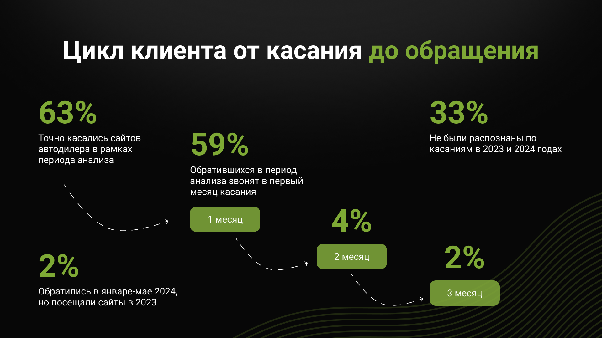 Еще одно наблюдение: в январе-мае 2023 года было 10% клиентов, которые посещали сайты компании в предыдущем году. В том же периоде 2024 года эта цифра снизилась до 2%. Это значит, что цикл клиента от первого касания до непосредственного обращения в салон сокращается.