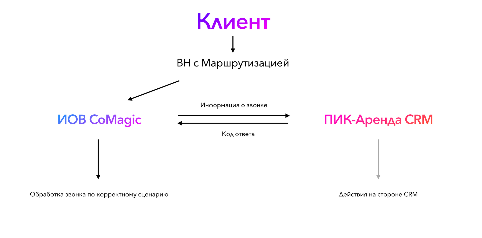 Чтобы реализовать маршрутизацию так, как ее видели в ПИК-Аренде, нужно было научиться опознавать клиента по номеру телефона, как уникальному идентификатору — жилец или собственник. Затем объединить эти данные с информацией по сделке – прикреплен ли клиент и если да, то на каком этапе и что нужно сделать. Эту логику в ПИК-Аренде реализовали внутри их самописной CRM-системы.