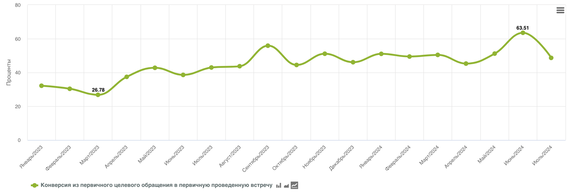 Рост конверсии из первичного целевого обращения в первичную проведенную встречу с января 2023 по июль 2024 – на 30 п.п., с 33% до 63%.