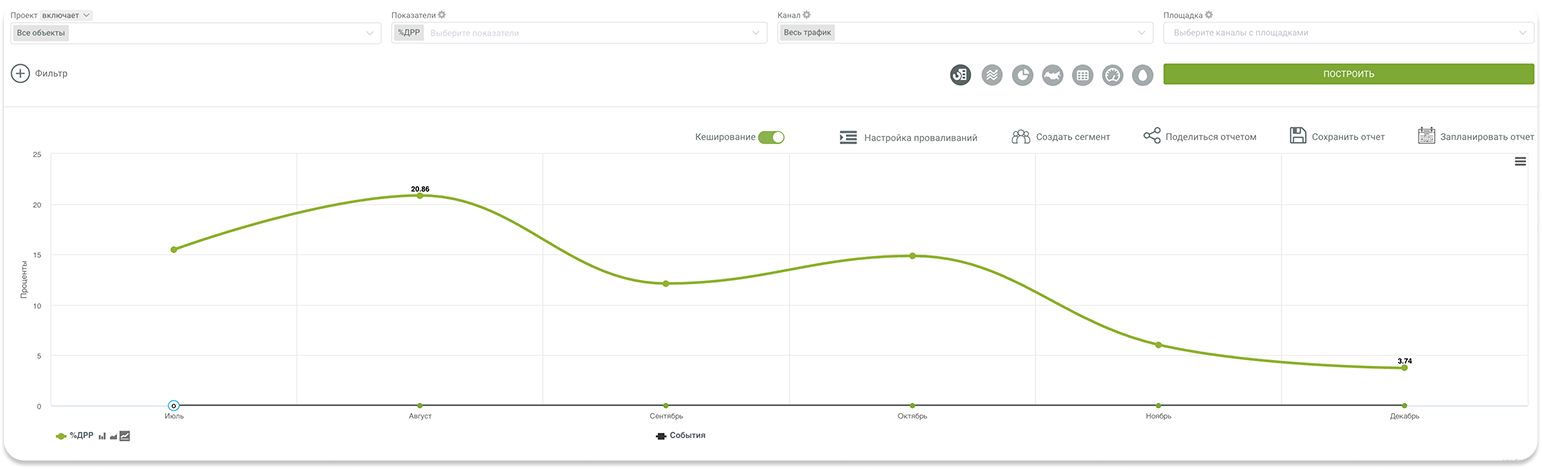 - Доля рекламных расходов сократилась в 5 раз при сокращении бюджета на 25%.
