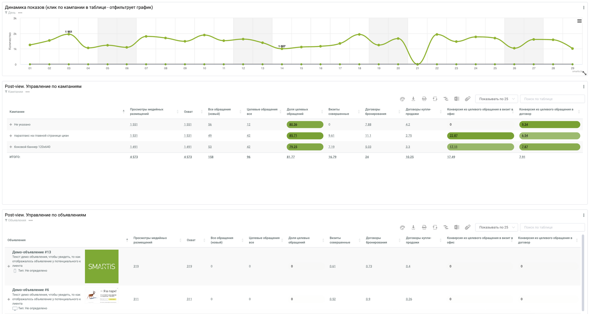 Для оценки эффективности охватной рекламы в Smartis есть: