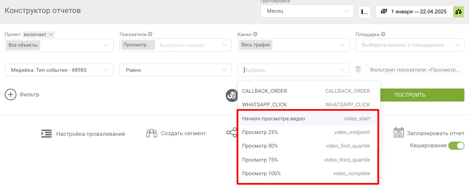 Для того, чтобы увидеть глубину просмотра, создайте отчет по просмотрам медийных размещений и добавьте фильтр «Медийка: тип события». Затем выберите нужный вариант: