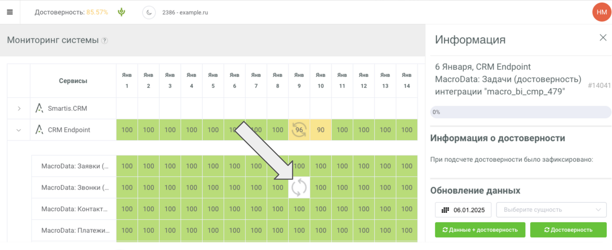 Для того, чтобы отслеживать достоверность по каждому дню, в Smartis есть функционал Smart-обновления. Благодаря ему система автоматически обновляет данные и пересчитывает достоверность везде, где она ниже 97%. Для этого нужно зайти в раздел Мониторинг системы, выбрать нужную интеграцию и в разделе Smart обновление и указать нужный период.