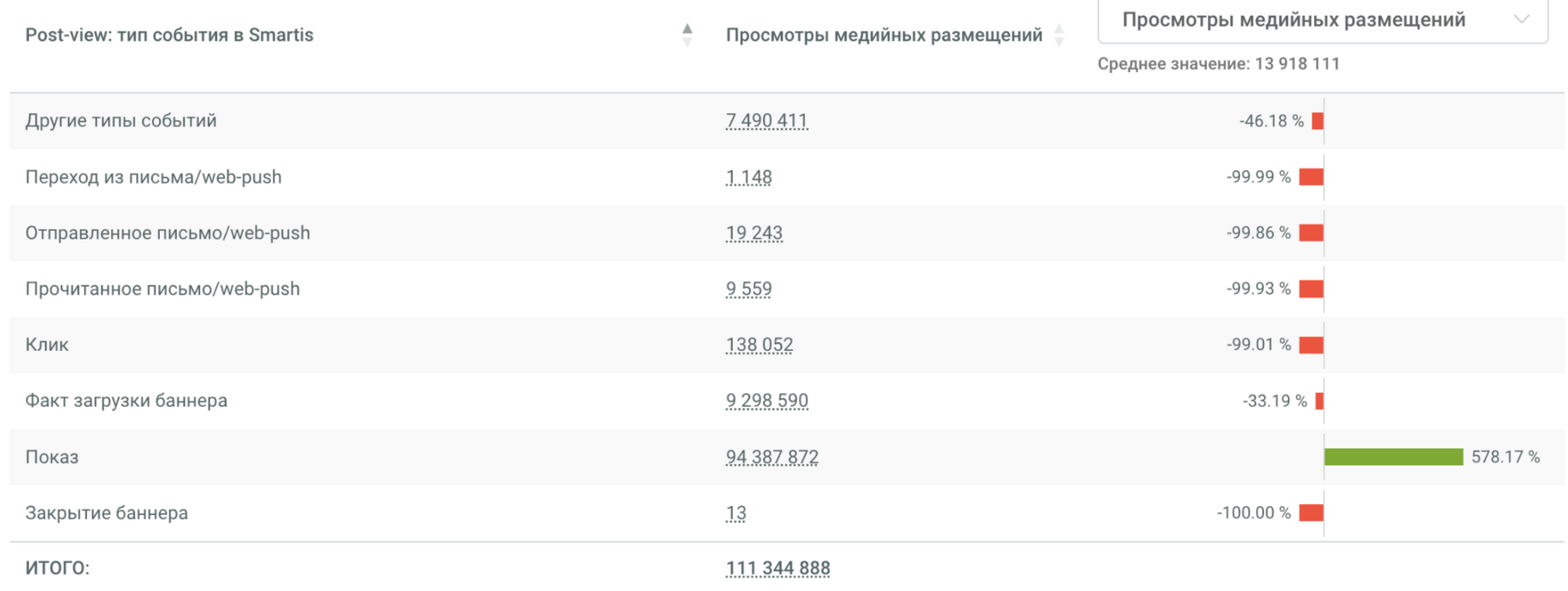 Также мы добавили группировку «Post-view: тип события в Smartis» для показателя «Просмотры медийных размещений». Можно строить отчет с новой группировкой по типу события, а не только фильтровать их.