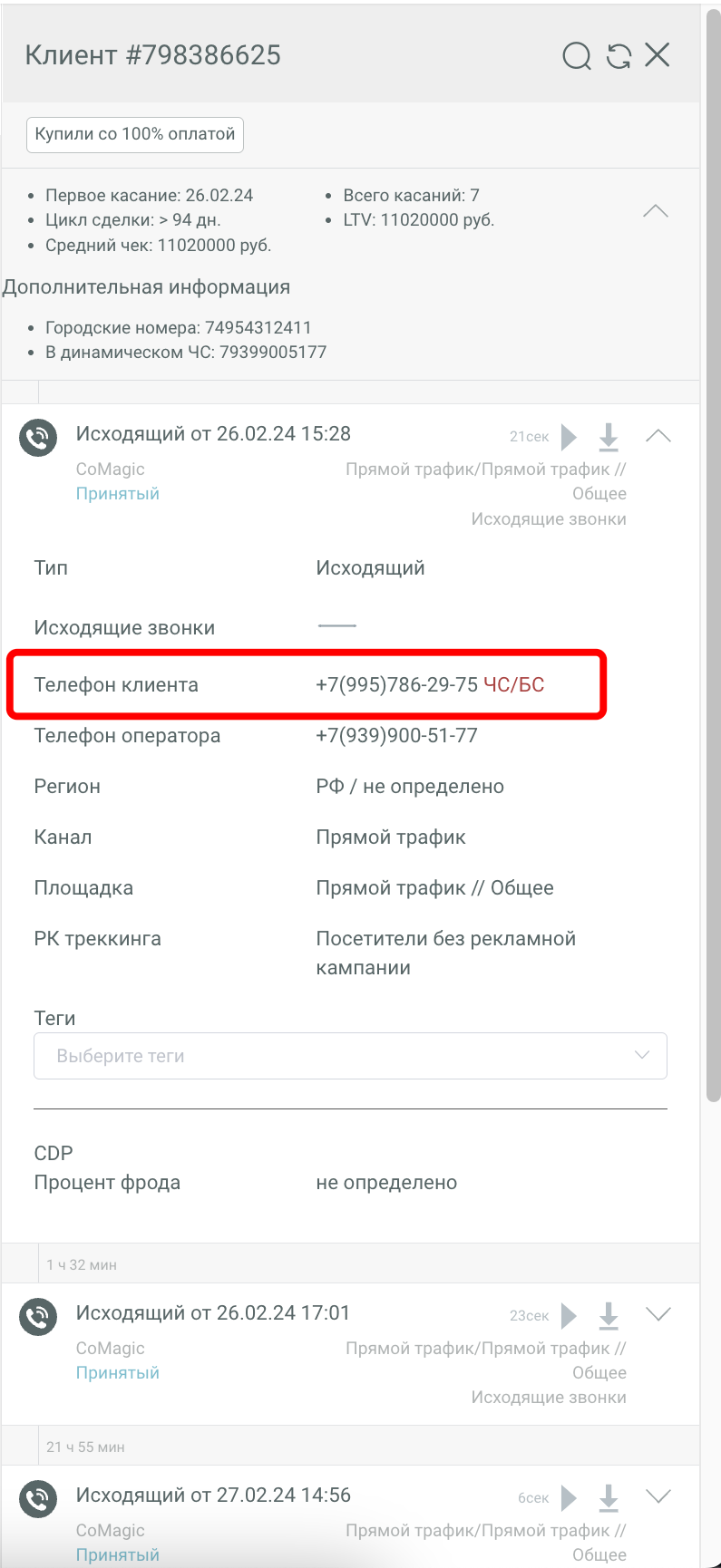 Также в CJM клиента при детализации звонка номер можно отправить в черный или белый список, при этом добавить причину добавления.