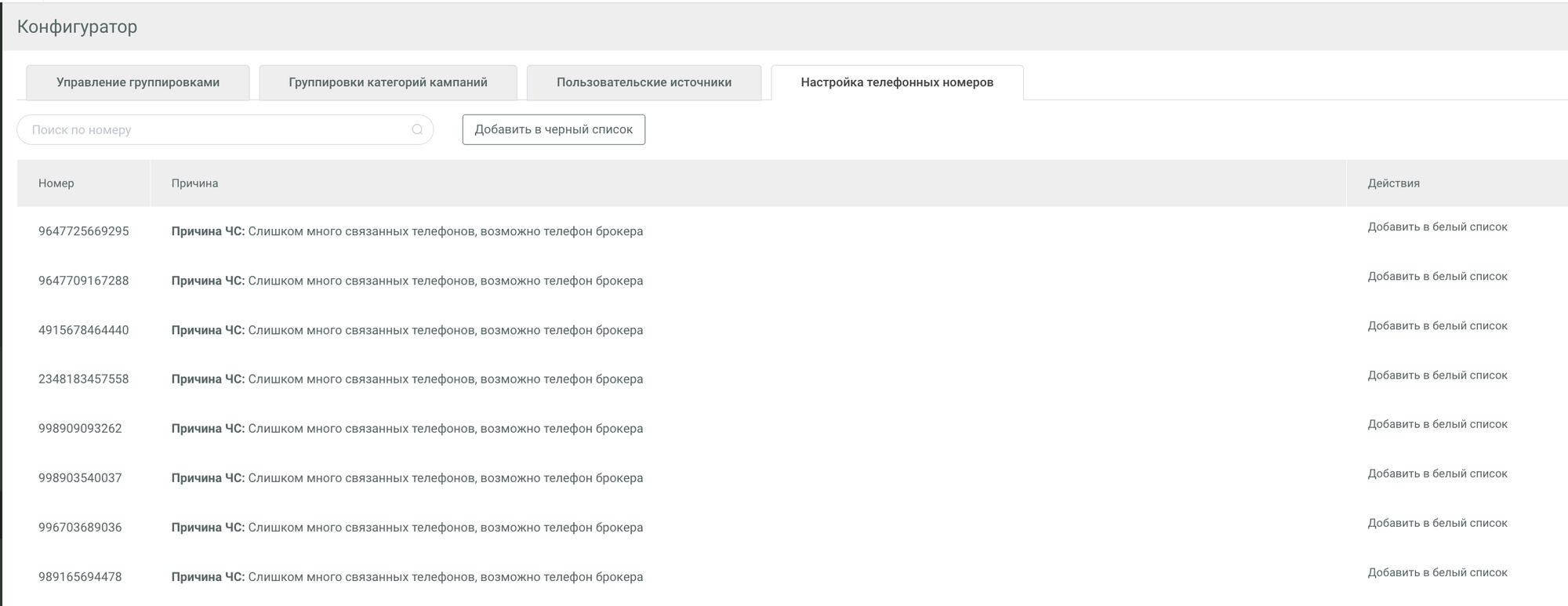 Его можно найти в разделе Администрирование > Конфигуратор > Настройка телефонных номеров. Здесь указан номер телефона, причина попадания в черный список и кнопка добавления в белый список.