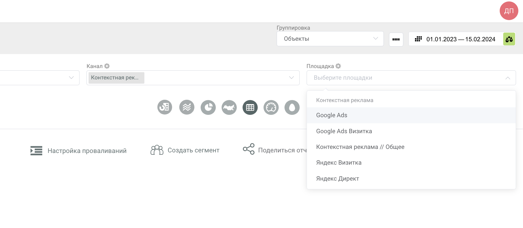 Но часто у застройщиков появляются задачи, когда базовых группировок недостаточно и нужно строить отчеты в разных срезах. Например: вам необходимо сравнить долю платного и бесплатного трафика. При этом все рекламные каналы разбросаны по другим группам. Как быть?