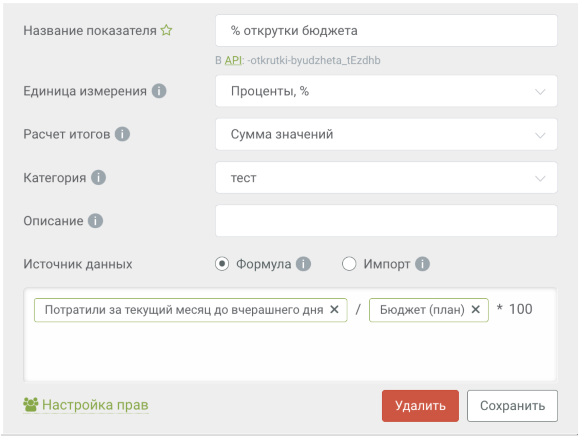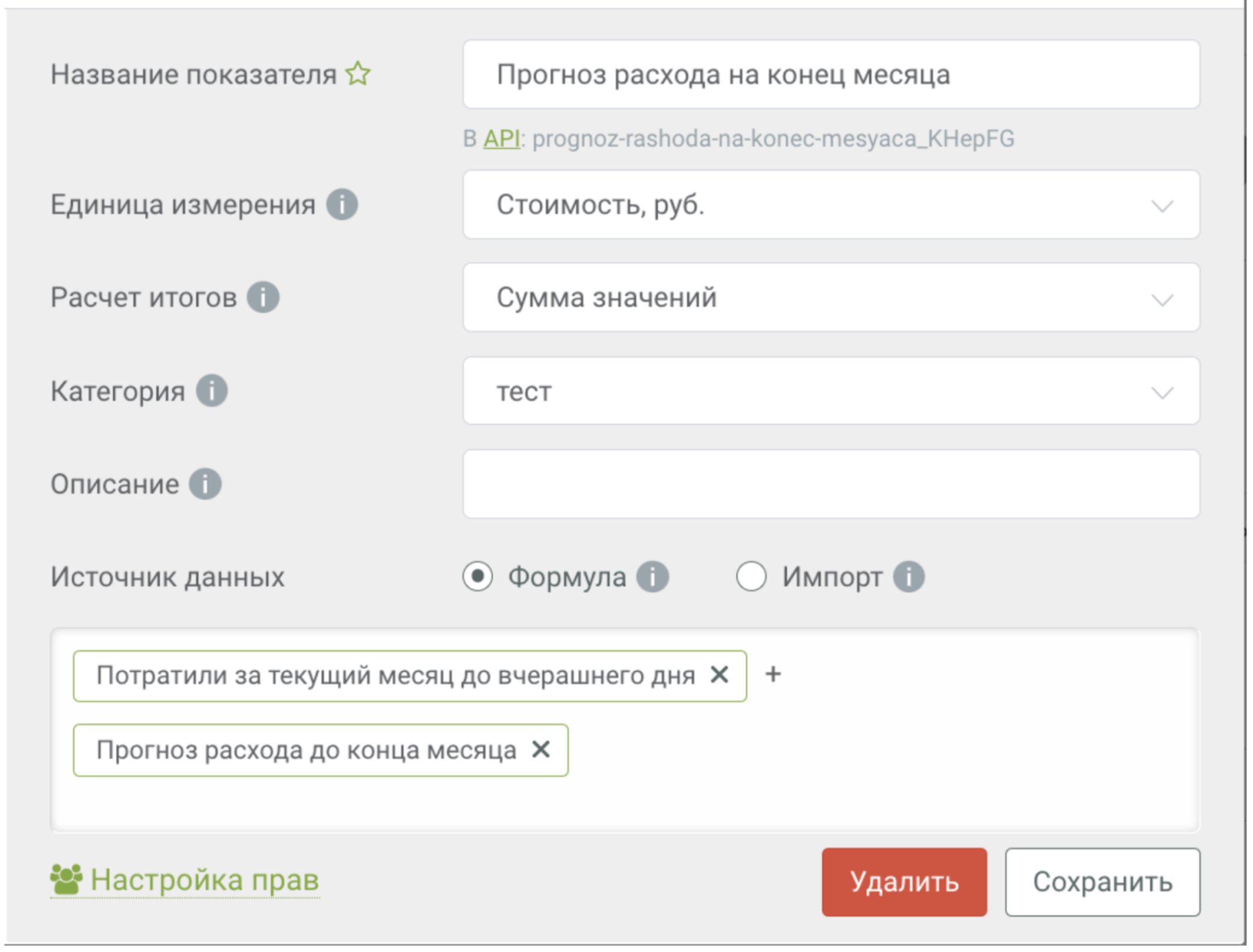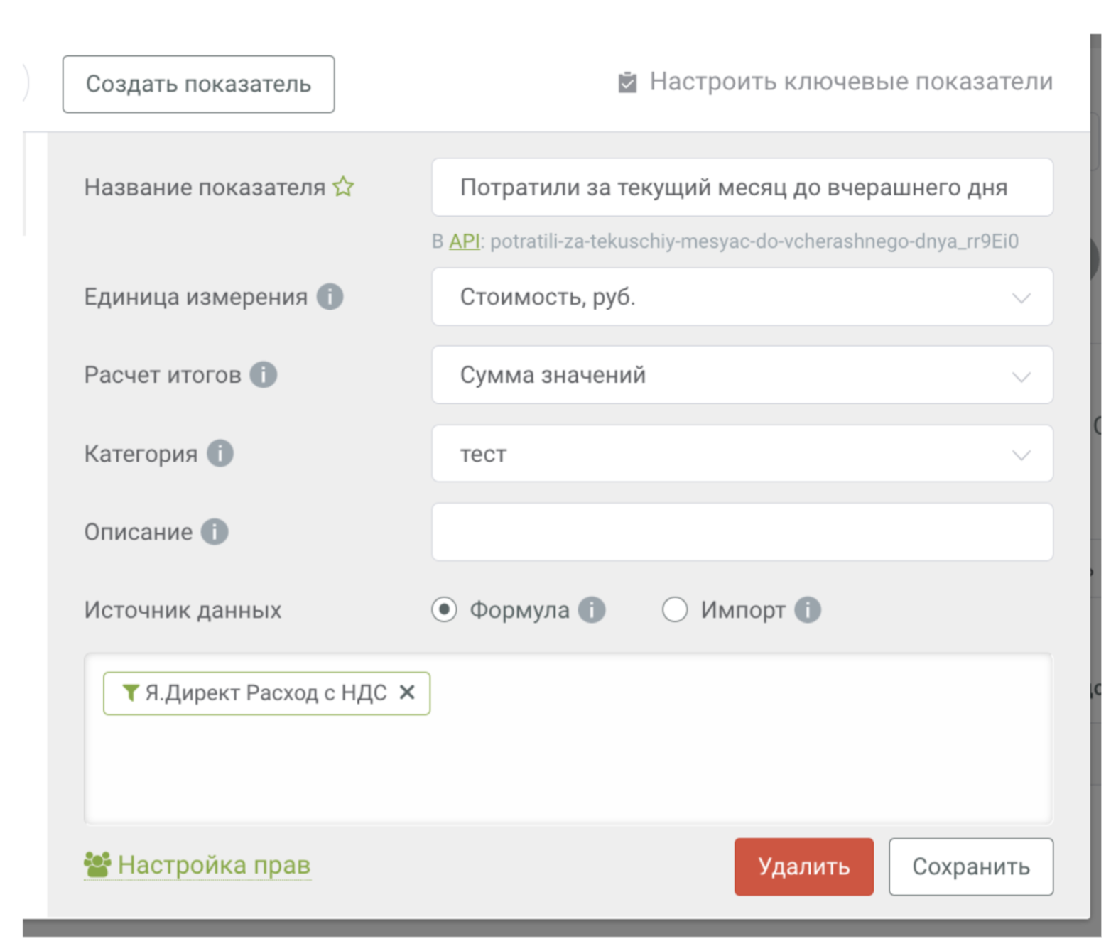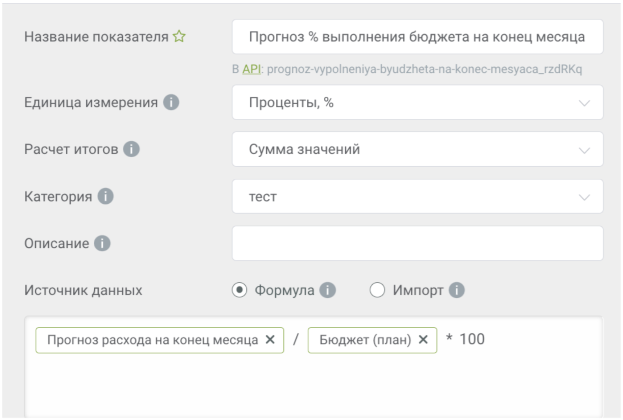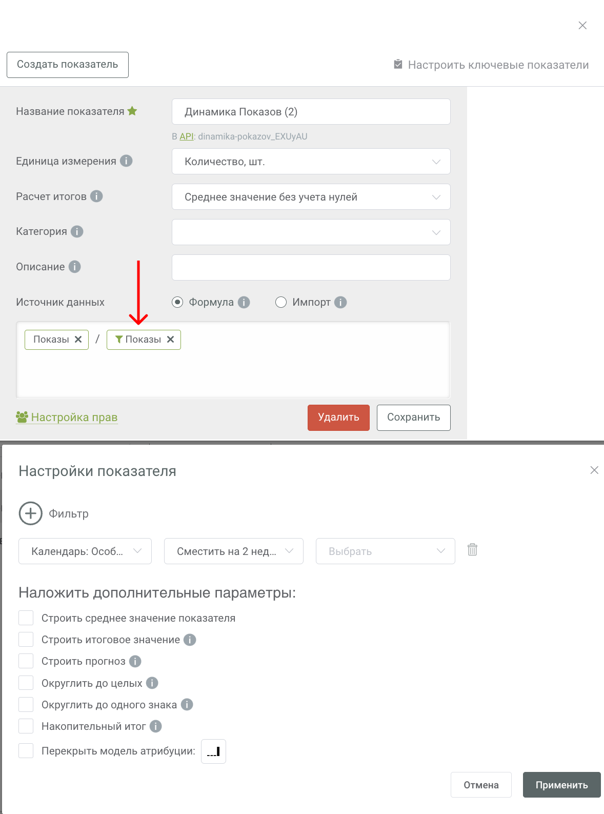 Расчет также применим и к показателям, созданным по формуле на основе данных интеграций, и к показателям на основеимпортированных из таблиц данных.