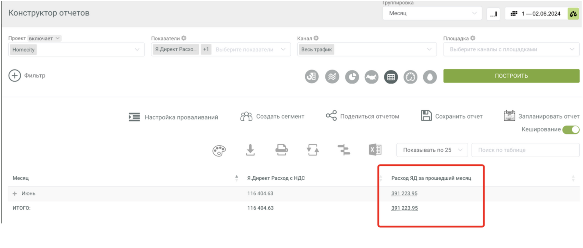 Аналогично можно настроить показатель с расходом за прошлый месяц и добавить его в отчет для сравнения с текущими показателями. В этом случае нужно добавить фильтр «Календарь: Особые настройки периода параметр» «Прошедший месяц».