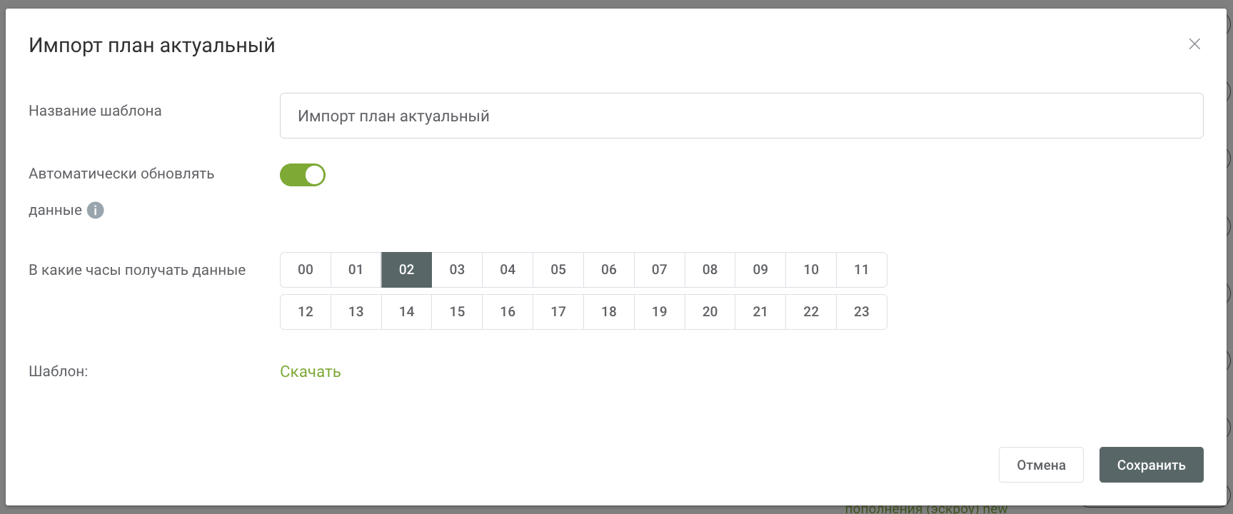 Как настроить время: Перейдите в раздел Импорт данных > История импорта, выберите нужный шаблон и перед вами откроется настройка с выбором времени.