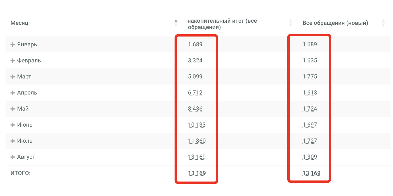 В Smartis появилась возможность построить отчет с накопительным итогом. В этом случае в каждой новой строке таблицы данные будут складываться с предыдущим периодом.