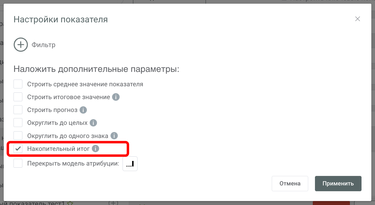 Для того, чтобы данные начали отображаться таким образом, нужно зайти в настройки показателя и поставить галочку Накопительный итог.