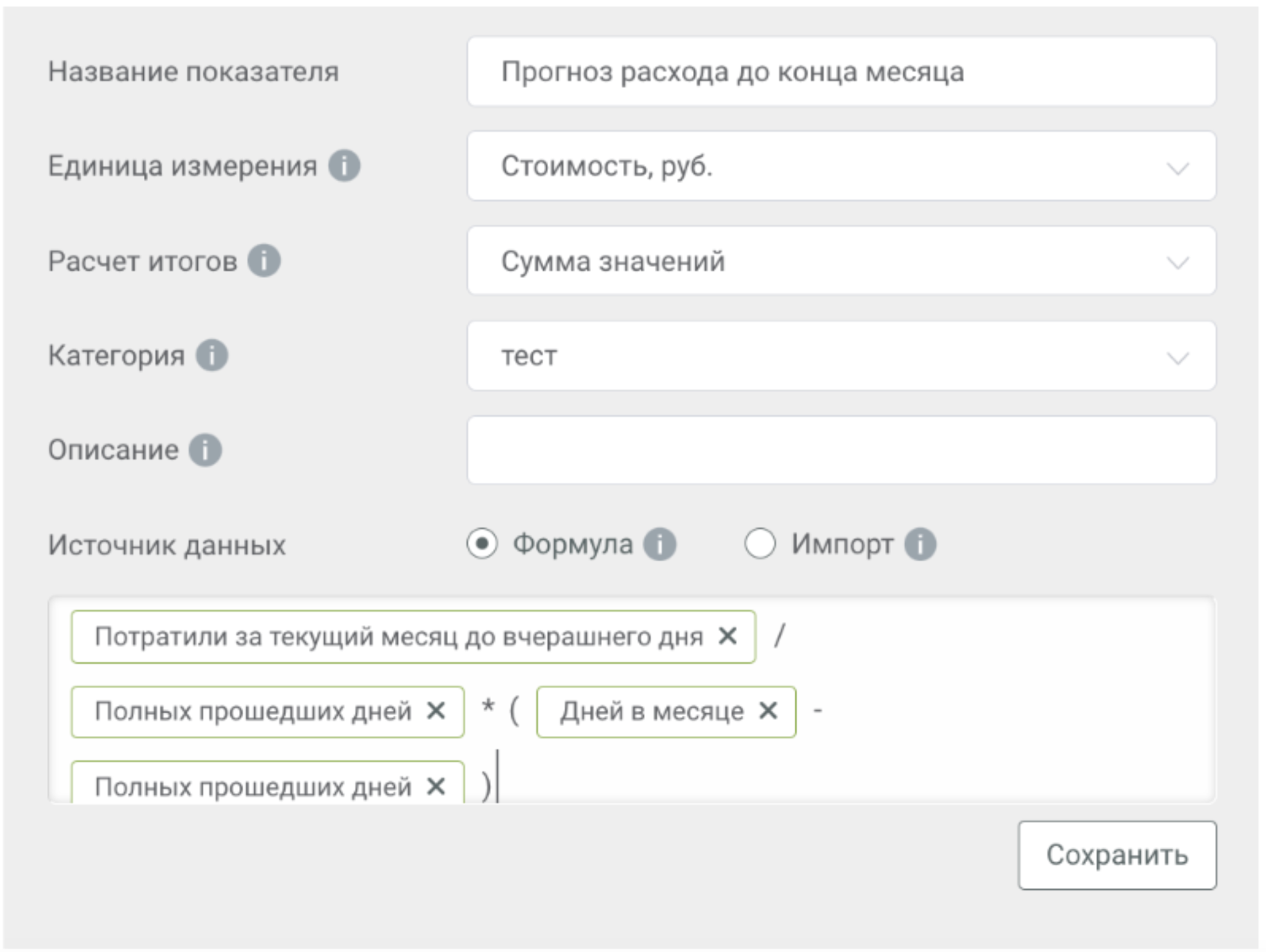Создайте показатель «Прогноз расходов на конец месяца». Для этого сложите показатели трат до вчерашнего дня и расходов до конца месяца.