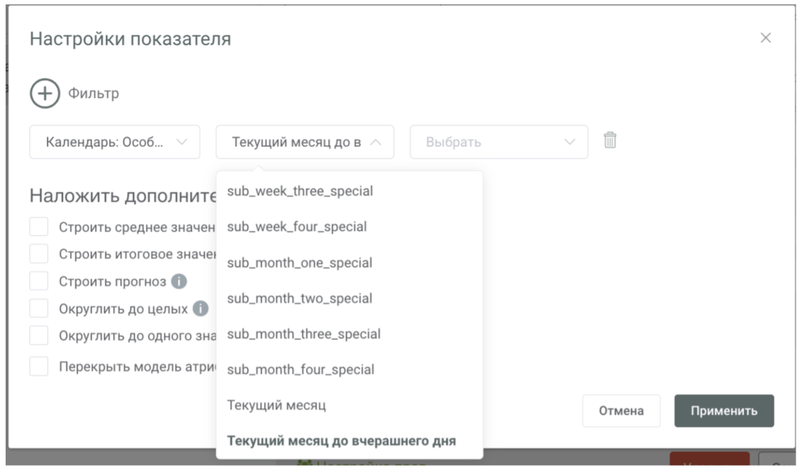 Для того, чтобы сравнить периоды в рамках одного отчета и в одной таблице, можно применить фильтр «Календарь: Особые настройки периода» и выбрать время смещения. Доступны следующие периоды: прошедший день, 1–4 недели, 1–4 месяца, 1–4 года.