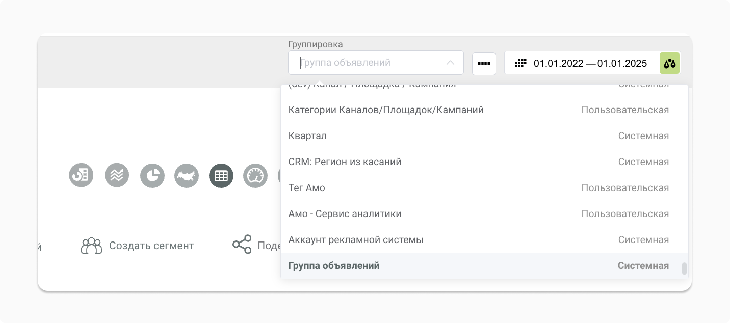 Группировка работает с показателями посетители, обращения, CRM-данные.