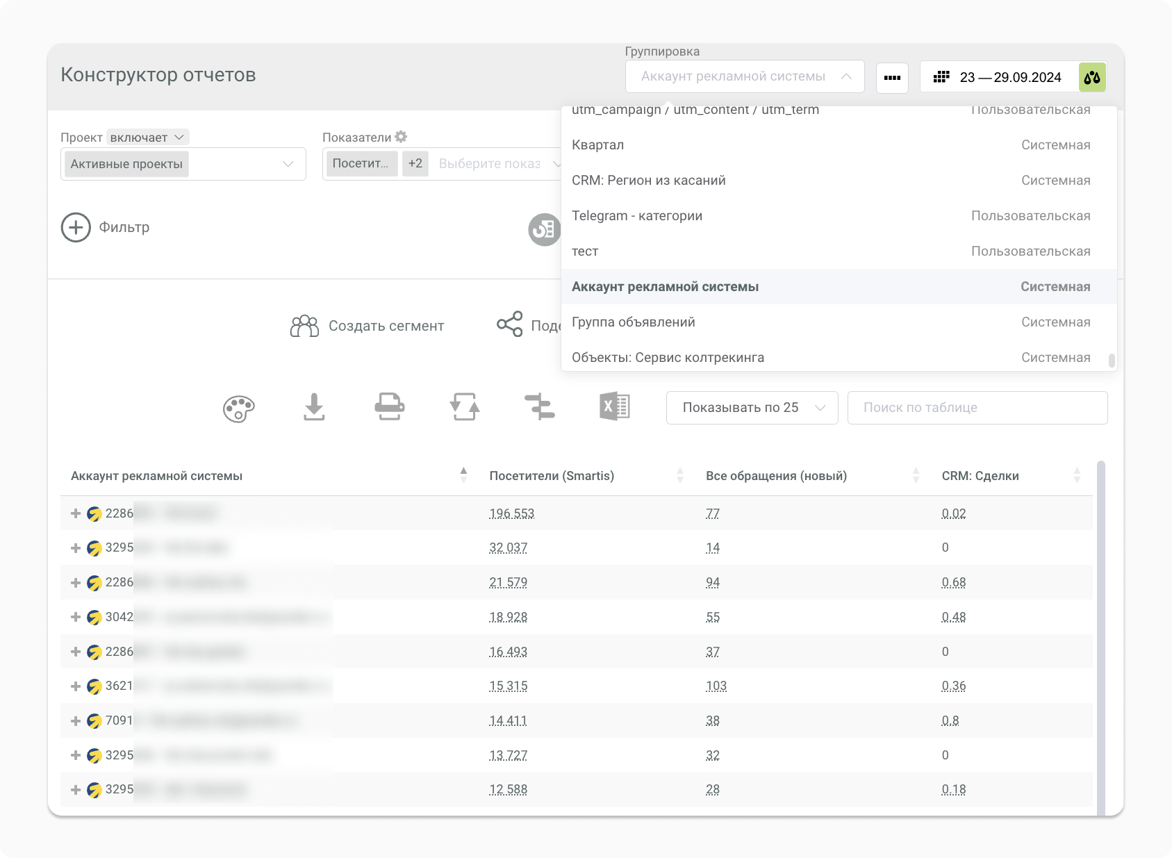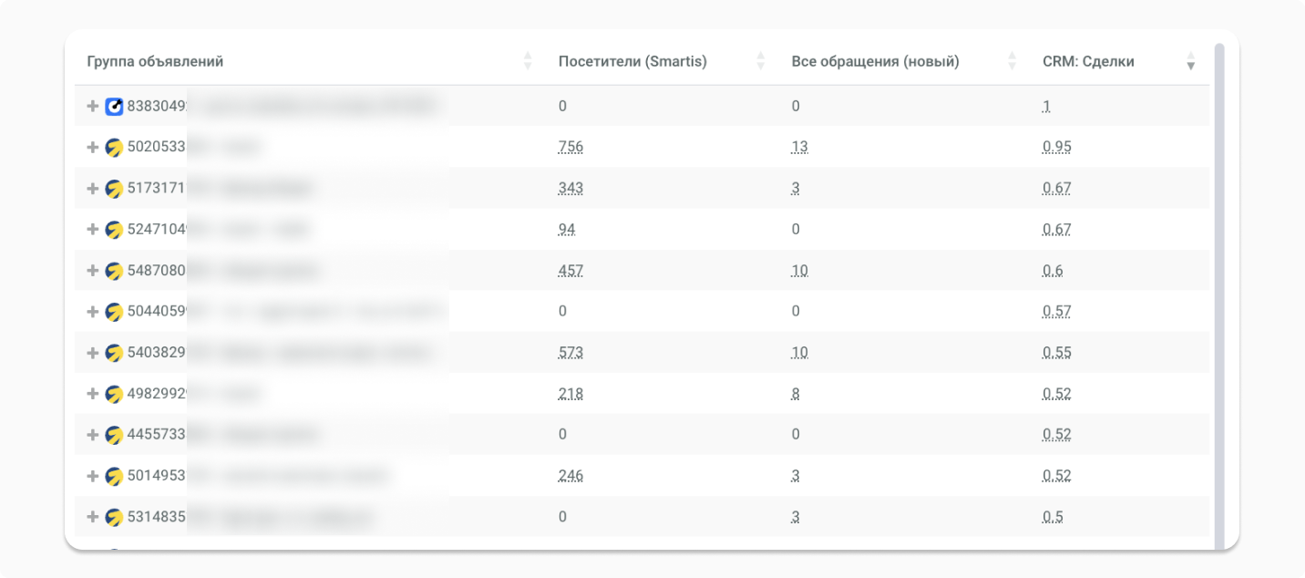 Группировка работает по тем же показателям, что и просто группировка объявлений – по посетителям, обращениям и CRM-данным.