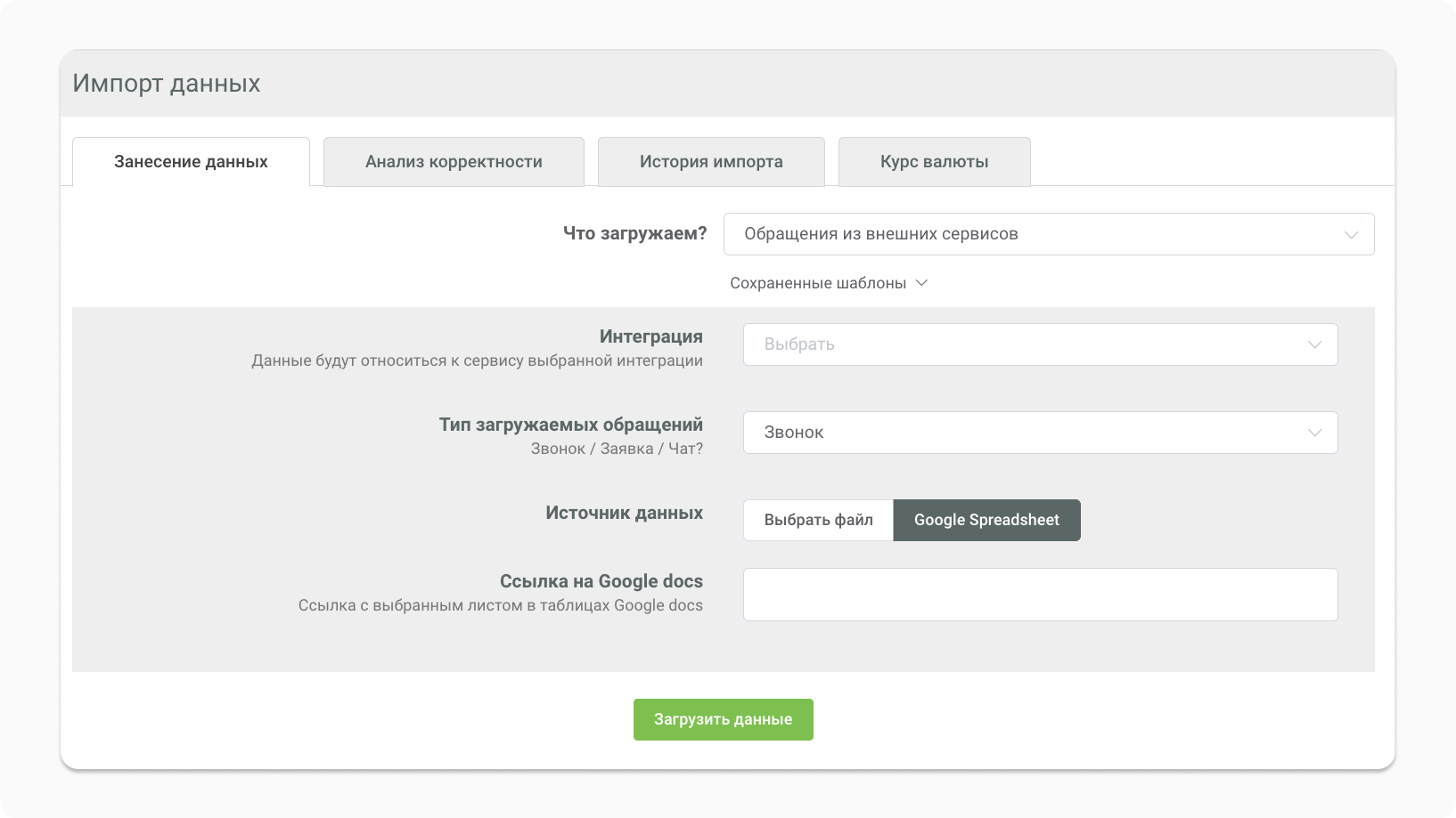 Мы обновили этот функционал и теперь импортировать обращения можно автоматически через Google-таблицу. Для этого нужно перейти в раздел Импорт данных - Занесение данных. Укажите, что вы загружаете обращения из внешних сервисов, выберите интеграцию, тип загружаемых обращений (звонок/заявка/чат), укажите источник данных Google Spreadsheet и добавьте ссылку на таблицу.
