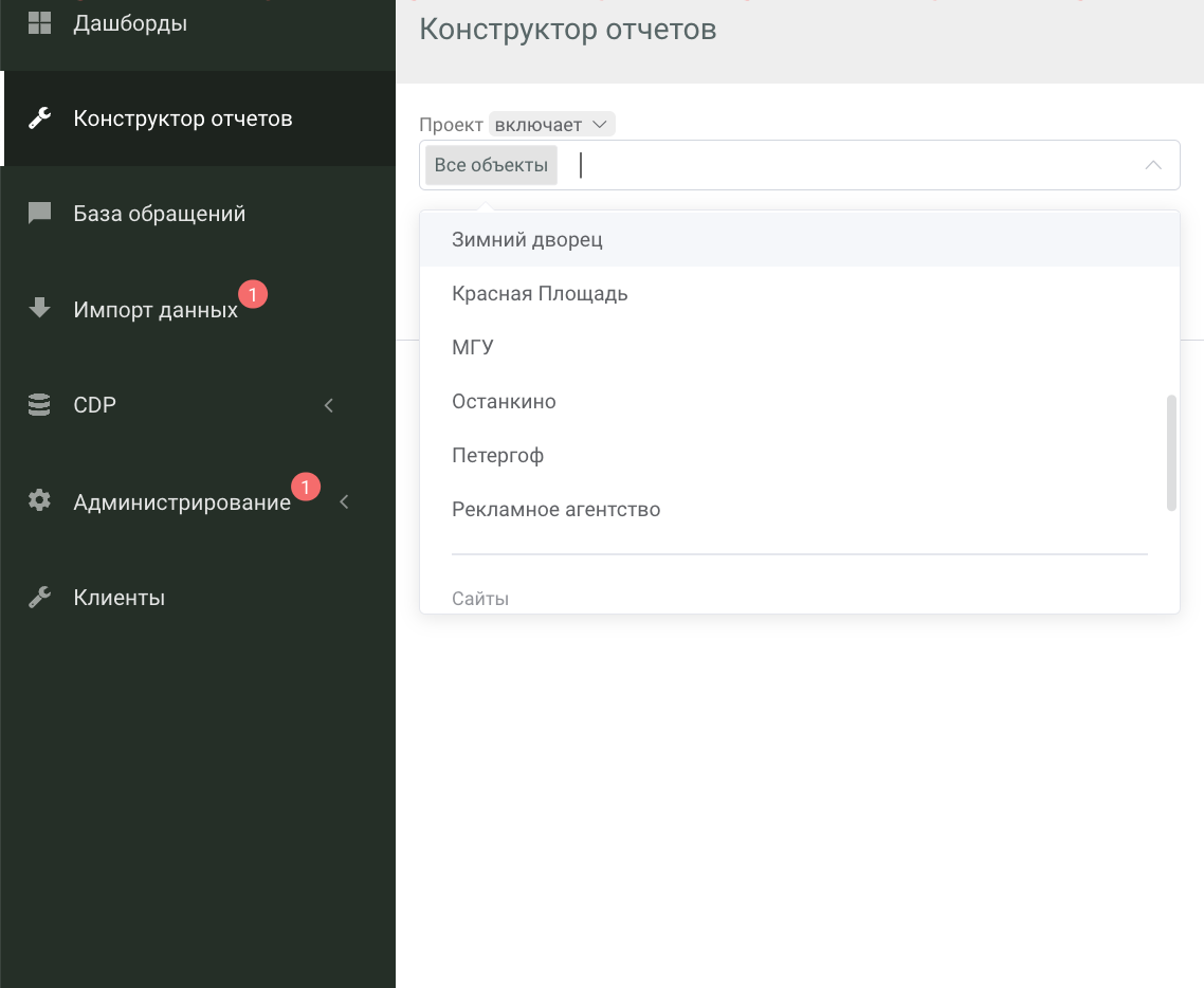 Иногда у маркетологов застройщиков появляется задача посмотреть данные по разным наборам проектов. Например, если у вас есть несколько проектов в Москве и Санкт-Петербурге, и вам нужно собрать информацию по всем ЖК в одном из городов. Либо сделать выгрузку отчета только по ЖК определенного класса недвижимости.