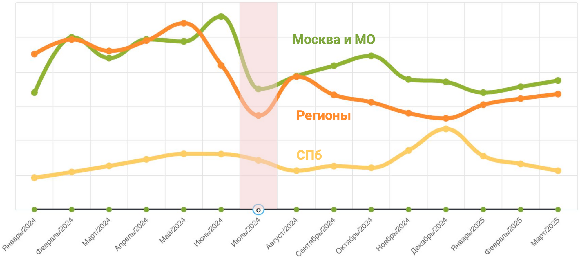 У каждого региона есть собственная динамика просадки сделок, но в среднем количество продаж уменьшилось на 32%.