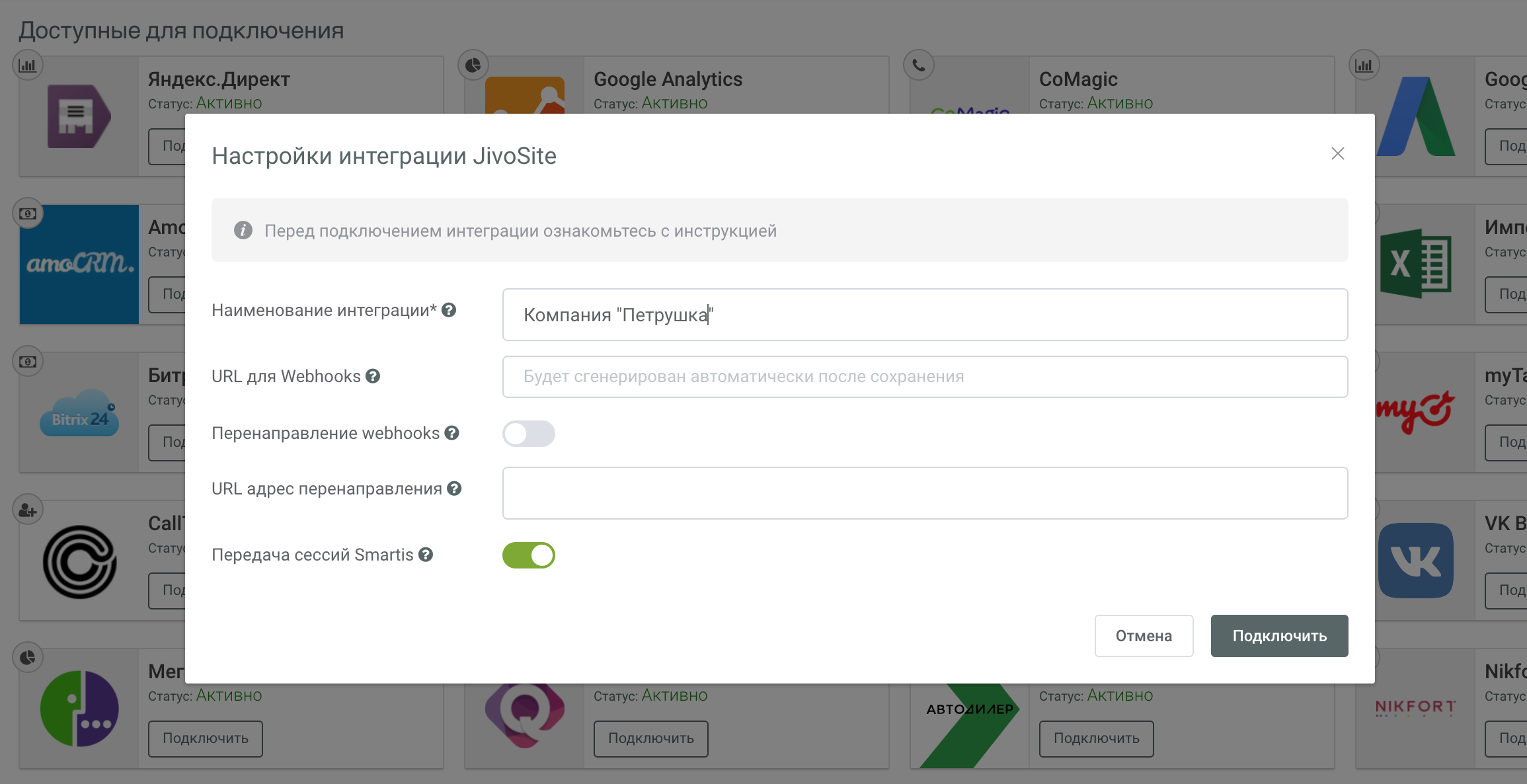 Если у вас уже настроены webhooks на другой адрес (JivoSite позволяет отправлять webhook только на один адрес), воспользуйтесь дополнительной возможностью Smartis для пересылки webhooks. В настройках интеграции включите опцию «Перенаправление webhooks» и вставьте в поле «URL адрес перенаправления» текущий настроенный адрес для webhook в кабинете JivoSite.