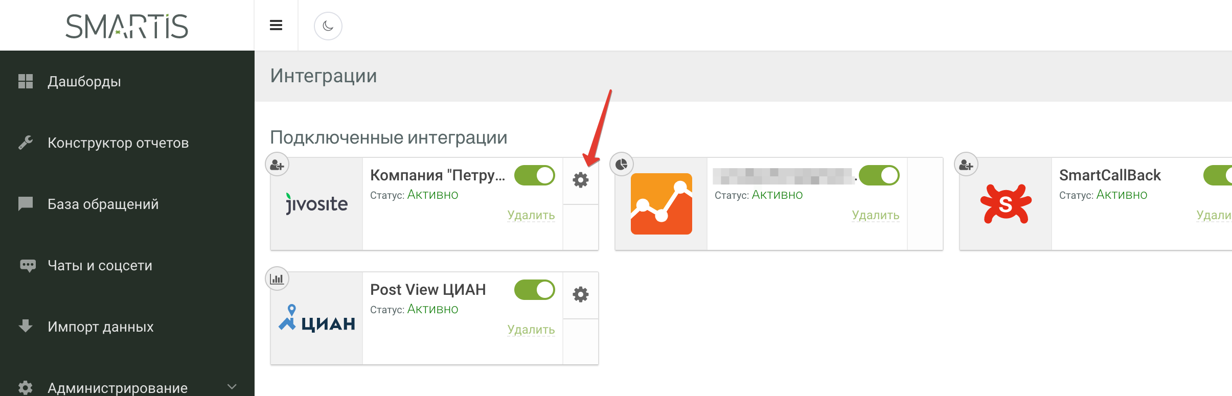 - Зайдите на страницу управления интеграциями Smartis в разделе администрирования: https://my.smartis.bi/admin/integrations