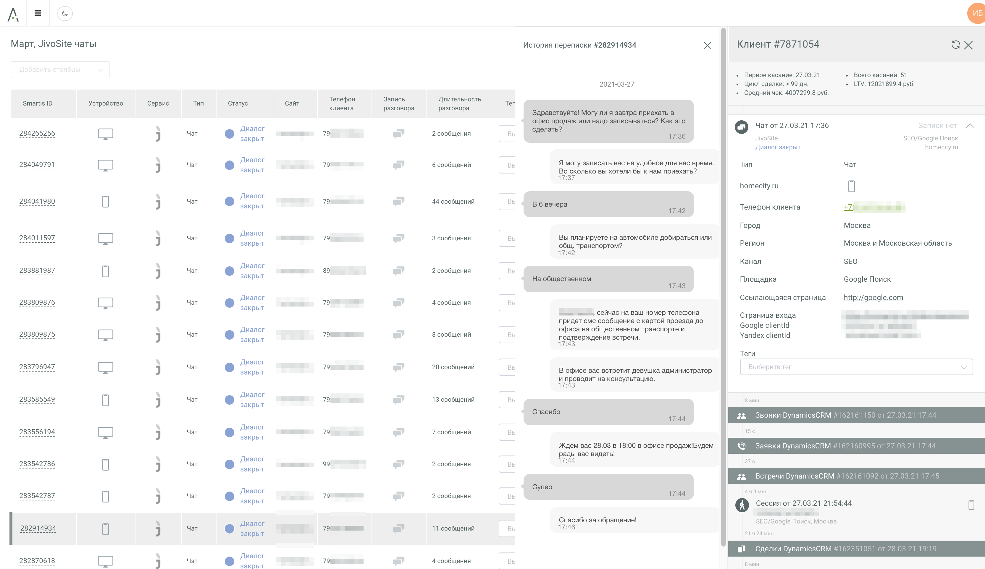 Смотреть сырые данные, читать диалоги прямо в Smartis и смотреть полные CJM клиентов со всеми источниками и другими способами коммуникаций: