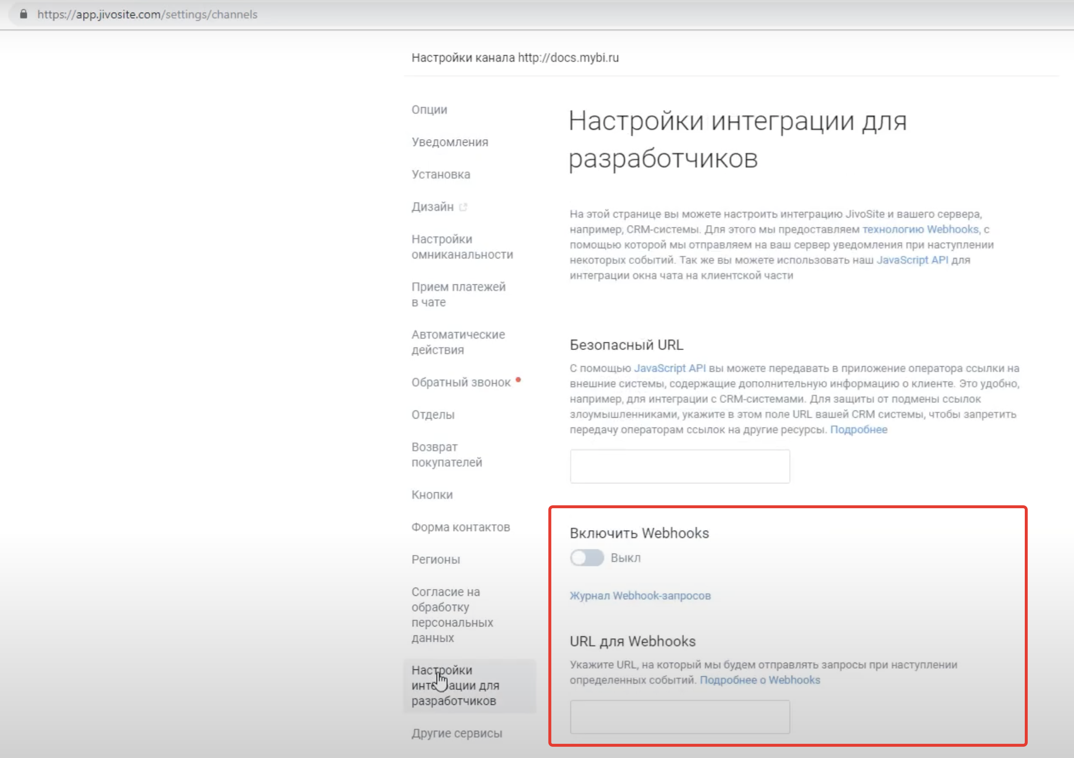 Переходим в настройки интеграций личного кабинета JivoSite: https://app.jivosite.com/settings/channels