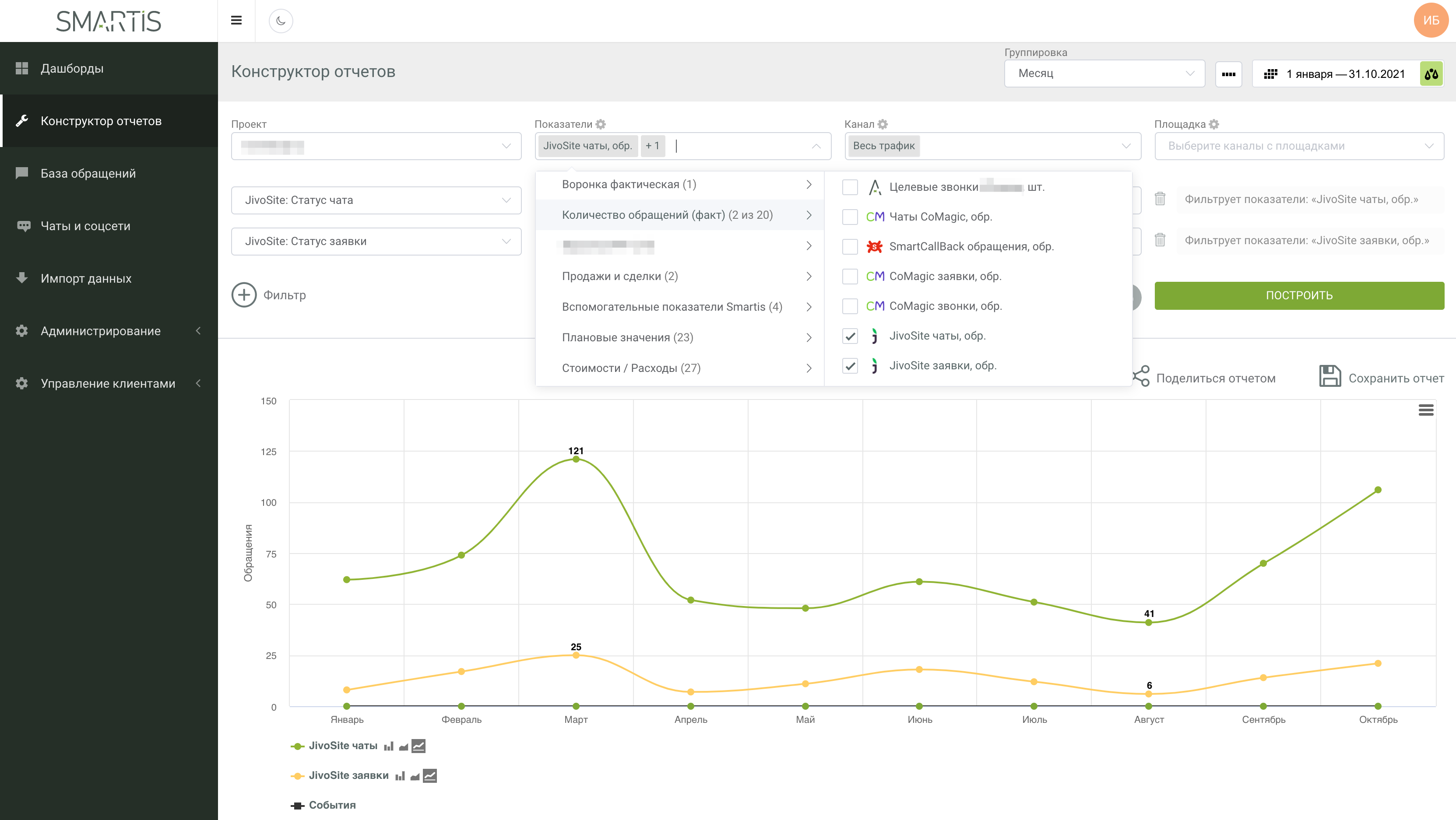 Чтобы использовать данные JivoSite в отчетах Smartis, нужно привязать сервис к сайтам (если нужно, то с дополнительной предварительной фильтрацией в привязках) и использовать пришедшие данные из JivoSite в качестве показателей для построения отчетов: