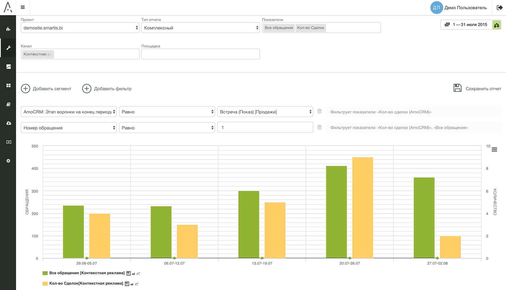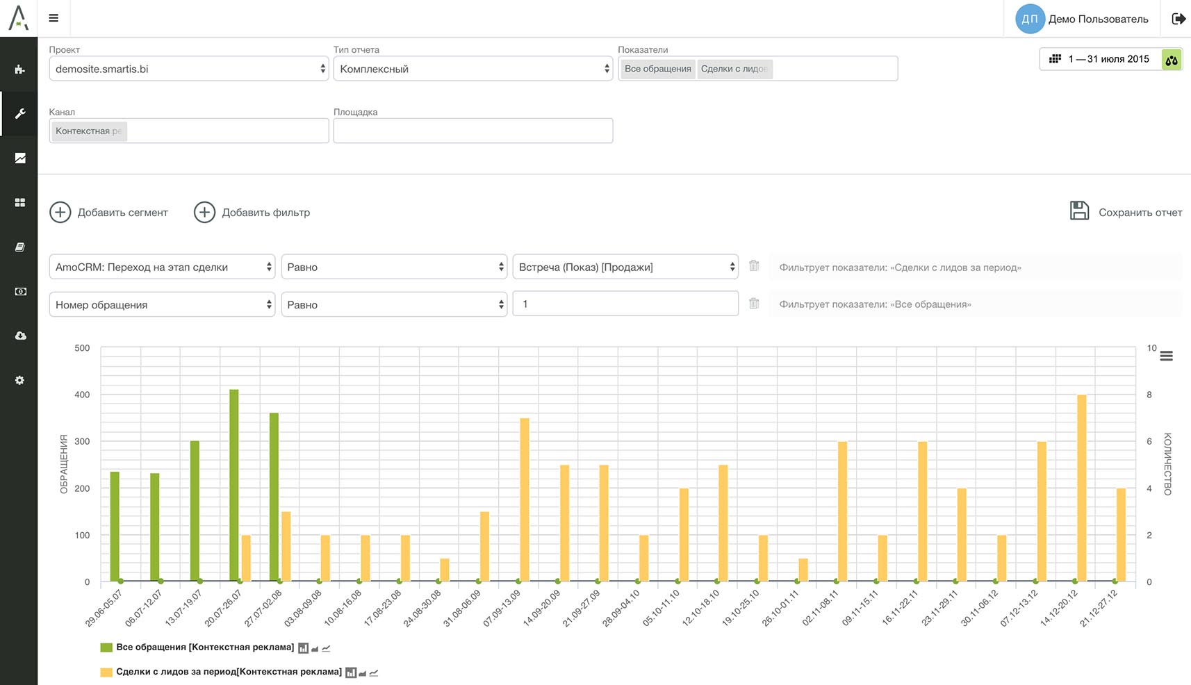 Строим суммарное количество первичных обращений (Входящие звонки + Обратные звонки SmartCallBack + Чаты) с контекстной рекламы и сделки в статусе "Встреча (Показ)" тоже с контекстной рекламы.