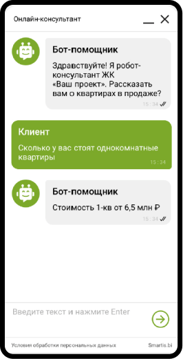Имитируется общение с оператором — человек пишет сообщение в зависимости от подготовленного скрипта, бот отвечает на сообщение заготовленным текстом
